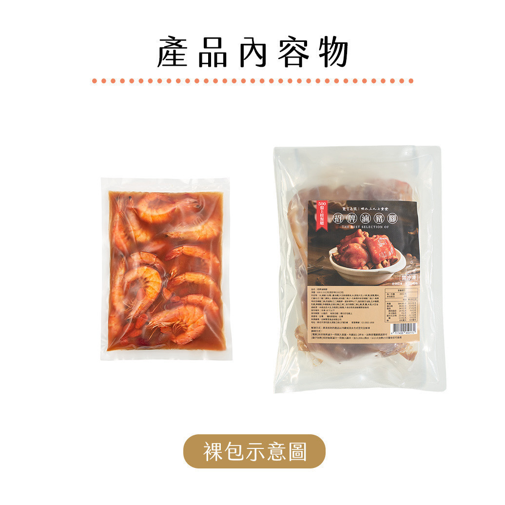 商品詳情 馬躍福袋C組 內容物:招牌滷豬腳800g x1 / 甘露甜醉蝦600g x1 / 小福袋 x1 產品營養標示及食用復熱方式 請參考各產品商品頁面 馬躍福C組_(豬腳800g+醉蝦600g) TWD $1,559 TWD $1,380